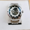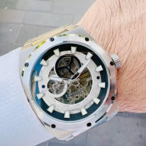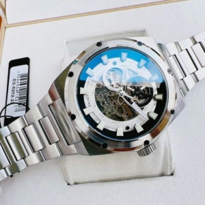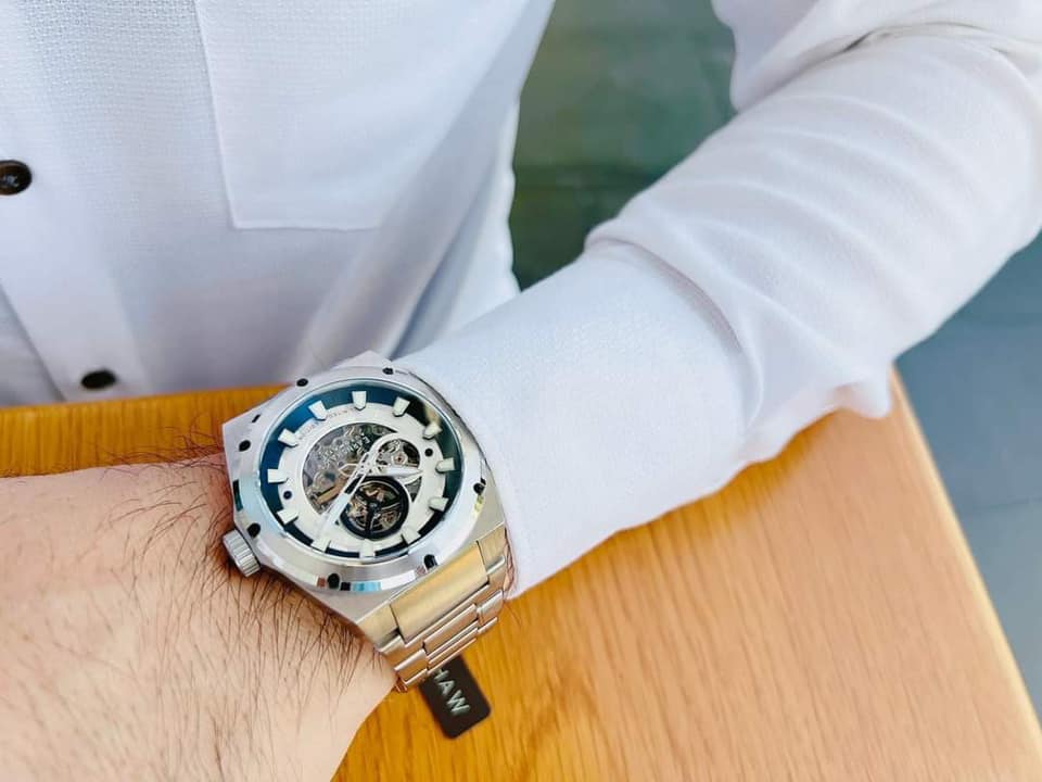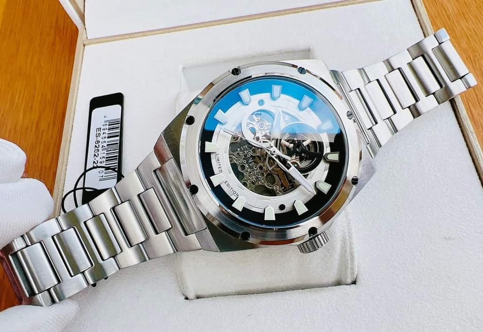 Case 44, kính Mineral, nền trắng viền thép không gỉ, lộ cơ céc ci.